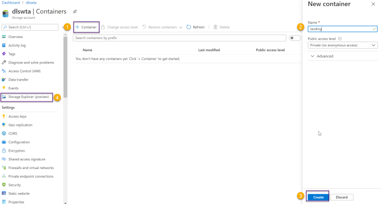 Then click on + Container and follow the steps to create a new container, as shown in the image below. Create one container for each zone and name them landing and cleansed, then head over to Storage Explorer.