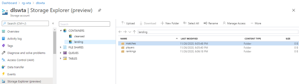 In the Storage Explorer page, expand Containers and in the landing zone create one folder for players, matches and ranking files in the tennis_wta dataset.