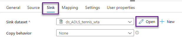 On the Sink section of the Copy data activity click Open to open the ds_ADLS_tennis_wta dataset.