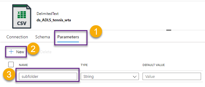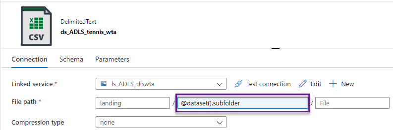 We will store the ranking files in the landing/rankings folder of the data lake. Let’s use a parameter for the folder path. In this way we can reuse the ADLS dataset, to store files in the designated folder, regardless of the type of file we want to store (players, rankings or matches).