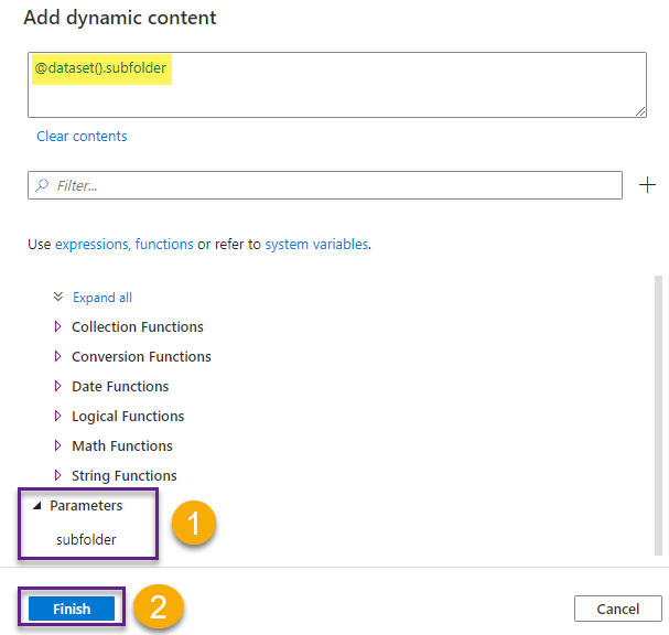In the Add dynamic content window, select the subfolder parameter we just created, from the Parameters list. Click Finish.