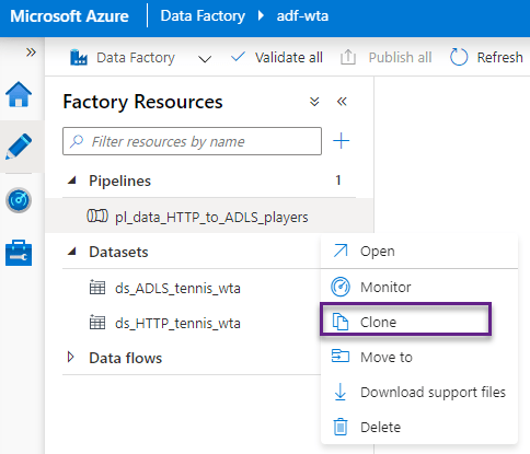 Clone the pl_data_HTTP_to_ADLS_players pipeline as shown in the image below, and name it pl_data_HTTP_to_ADLS_rankings. This will create a copy of the pipeline.