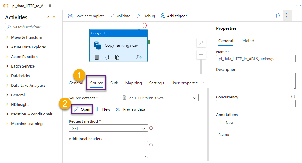 Switch back to the pipeline and select the Copy data activity. From the Source section, click Open to open the ds_HTTP_tennis_wta dataset.