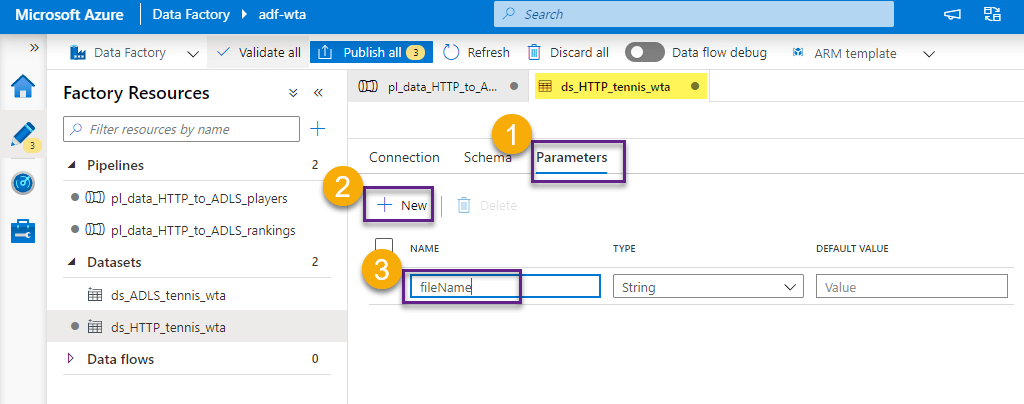 We want to automate the file copy process by passing the filename as a parameter to the dataset. We will update the ds_HTTP_tennis_wta dataset to accept the filename as parameter instead of hardcoded value.