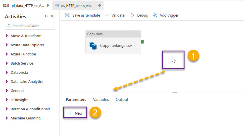 Click on the white surface of the control flow, to unselect the Copy data activity. Note that the bottom panel changes. In the Parameters section we can add parameters to the pipeline itself. Click + New to add a new pipeline parameter.