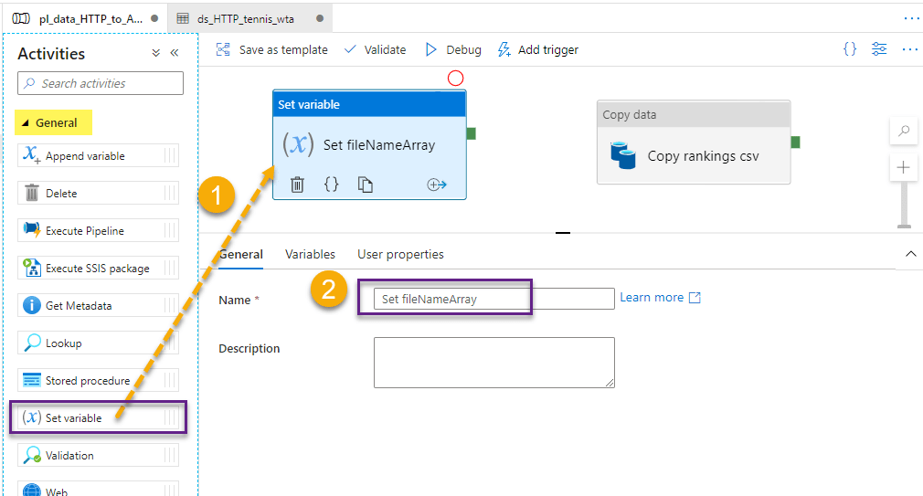 Drag and drop a Set variable activity to the control flow and name it Set fileNameArray.