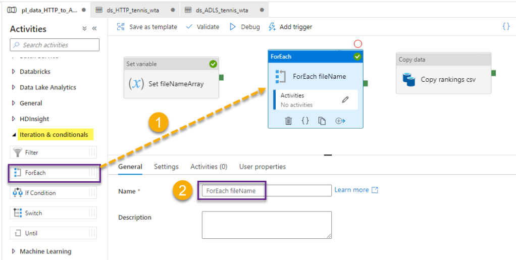 Locate ForEach activity under Iteration & conditionals and drag and drop it to the control flow area. Name the activity ForEach fileName.