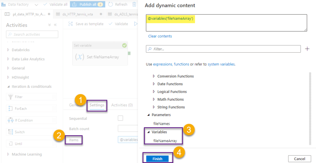 On the Variables section, choose the variable fileNameArray from the dropdown. Click to Add dynamic content in the Value field. In the Add dynamic content window build the following expression: @split(pipeline().parameters.fileNames,’,’)