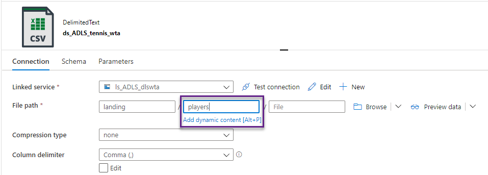 We will store the ranking files in the landing/rankings folder of the data lake. Let’s use a parameter for the folder path. In this way we can reuse the ADLS dataset, to store files in the designated folder, regardless of the type of file we want to store (players, rankings or matches).