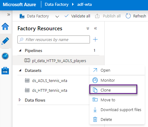 Clone the pl_data_HTTP_to_ADLS_players pipeline as shown in the image below, and name it pl_data_HTTP_to_ADLS_rankings. This will create a copy of the pipeline.