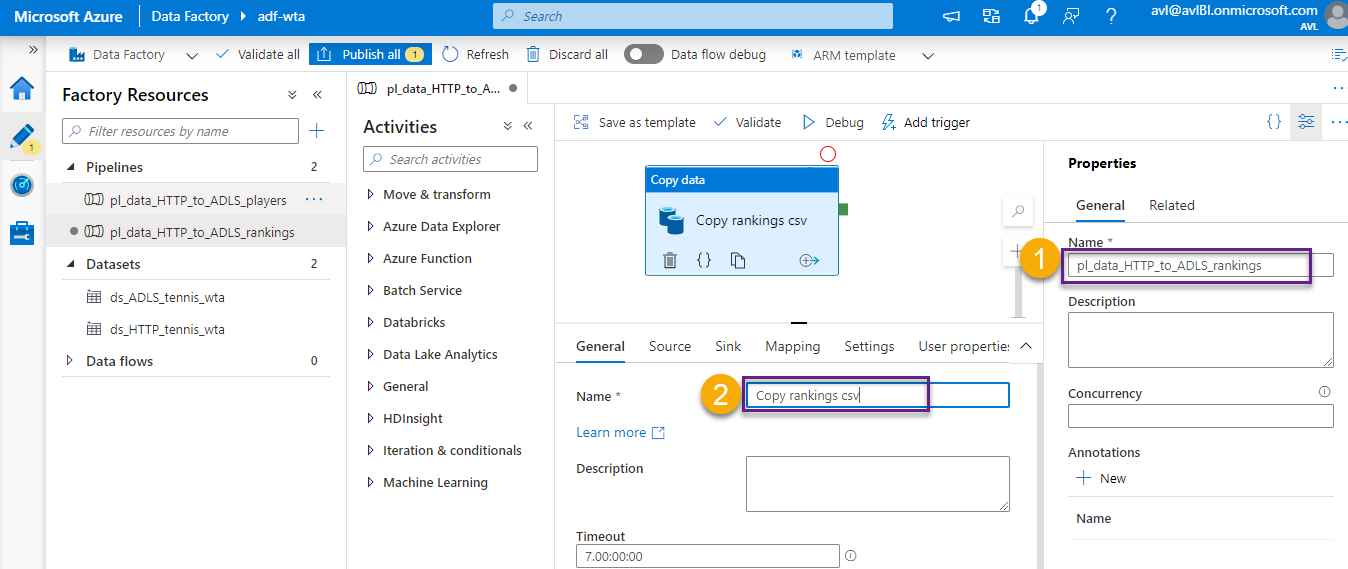 In the newly created pipeline, rename the copy data activity to Copy rankings csv.
