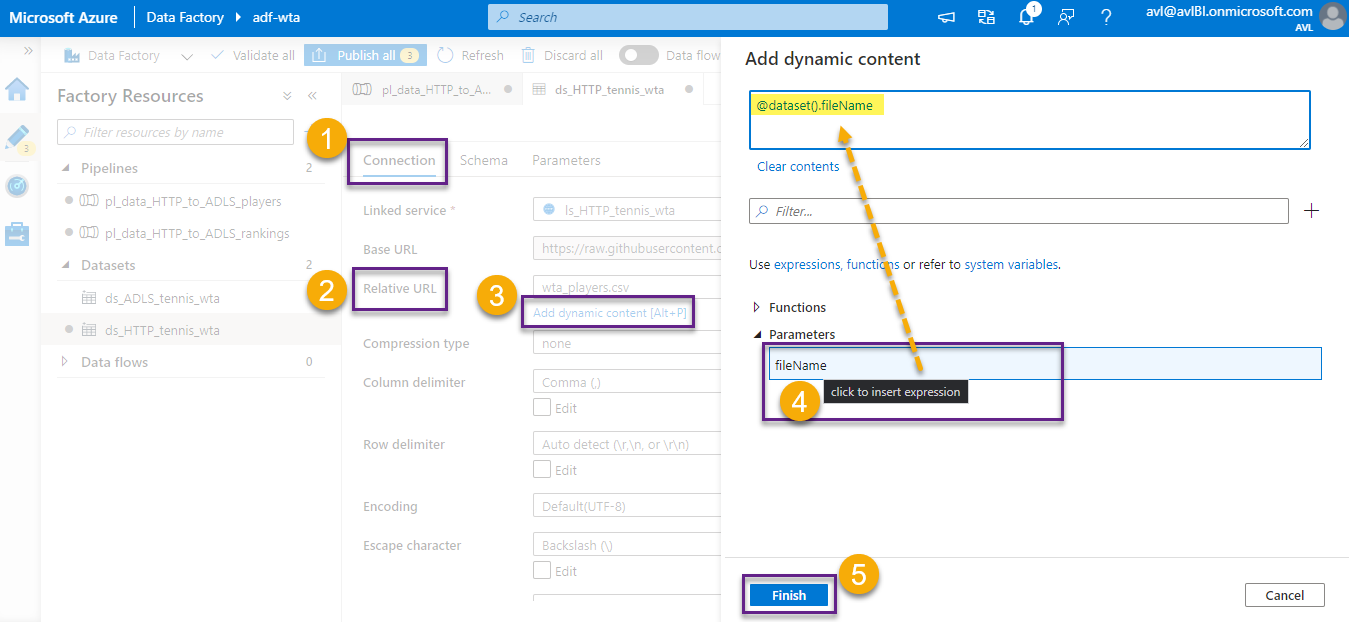 In the Connection section, select Relative URL and click Add dynamic content. In the Add dynamic content window, choose the newly created parameter. Click Finish.