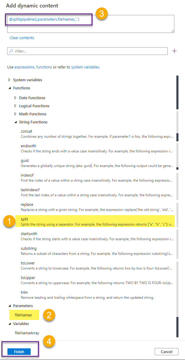 On the Variables section, choose the variable fileNameArray from the dropdown. Click to Add dynamic content in the Value field. In the Add dynamic content window build the following expression: @split(pipeline().parameters.fileNames,’,’)
