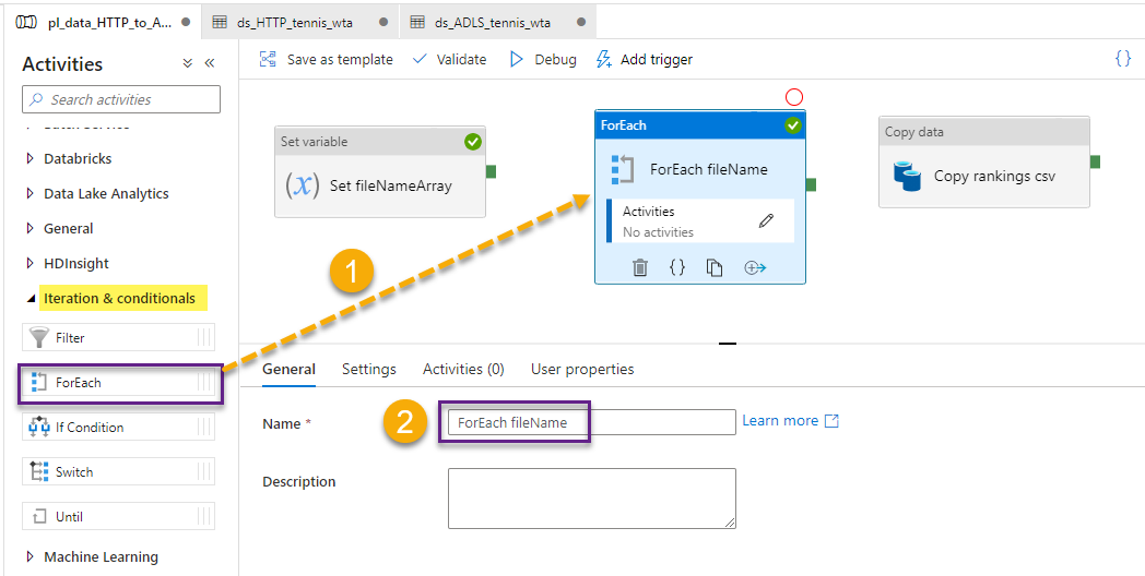 Locate ForEach activity under Iteration & conditionals and drag and drop it to the control flow area. Name the activity ForEach fileName.