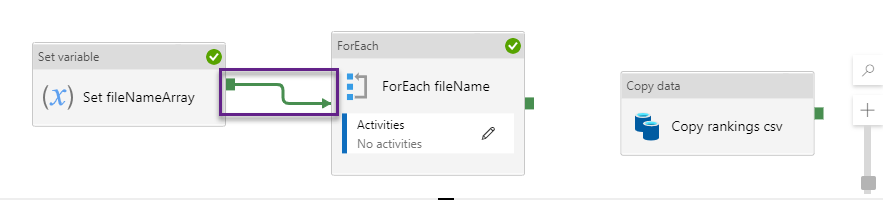 We have instructed the ForEach loop to iterate through the items in fileNameArray. Next, we need to specify the activities we want to run for each item. In our case, we want to run the Copy rankings csv activity, to copy each ranking file. For that, we will need to “move” the copy activity “inside” the ForEach loop.