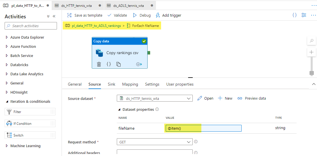 We want to automate the file copy process by passing the filename as a parameter to the dataset. We will update the ds_HTTP_tennis_wta dataset to accept the filename as parameter instead of hardcoded value.