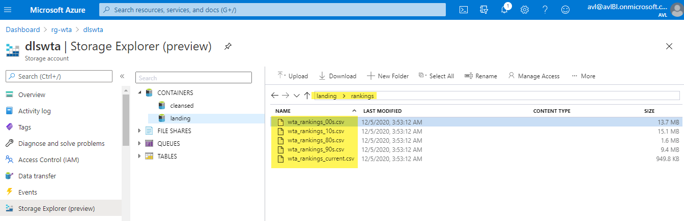 Just before we finish this post, head over to Azure Portal and check that the ranking files are now in the data lake. Find your way to the landing/rankings folder in your ADLS using Storage Explorer as described in the previous post.