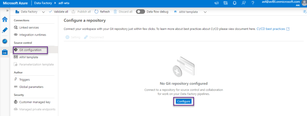 Head over to Azure Data Factory UI. From here, you have three different ways to initiate the code repository setup.