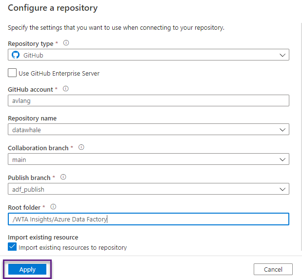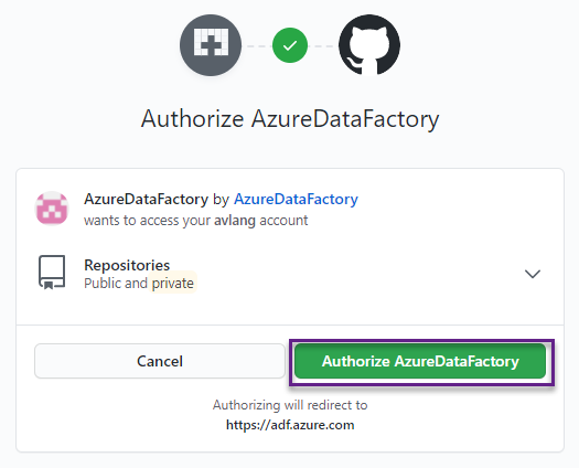 Authorize Azure Data Factory to access your GitHub.