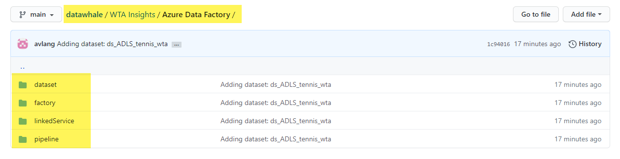 Switch over to your GitHub repository and validate that all the data factory artifacts are committed.