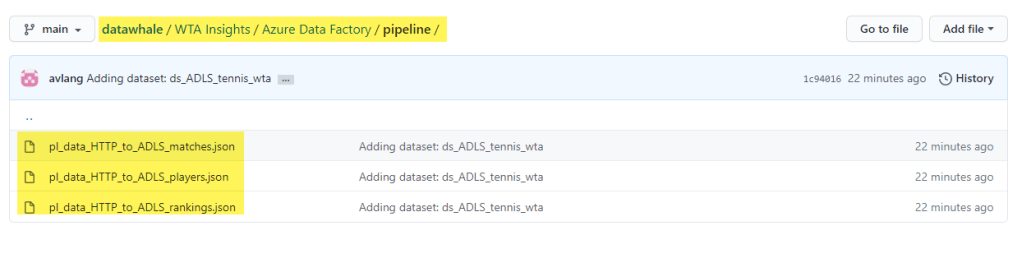 Navigate the folders to access the json files for linked services, datasets and pipelines.