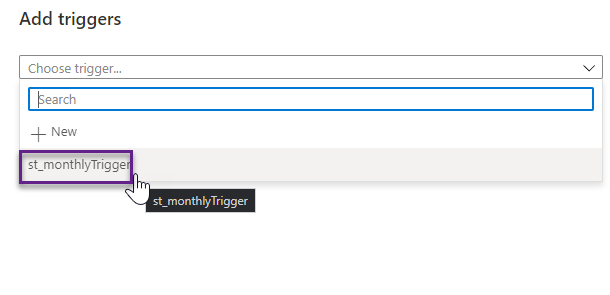 Switch to the Author tab to assign pipelines to the trigger. Select the pl_data_HTTP_to_ADLS_matches pipeline and click Add trigger > New/Edit. In the Add triggers window, select st_monthlyTrigger from the dropdown list .