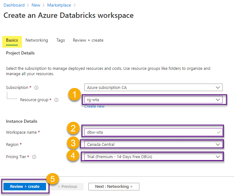 In the Create an Azure Databricks workspace page, in the Basics section, select your Azure subscription and the resource group you created during the Kickoff series. Name the Databricks workspace dbw-wta. Select the same region as for your resource group. For the Pricing Tier, choose Trial (Premium – 14-Days Free DBUs). Read more about Azure Databricks pricing here, and use your trial days wisely!