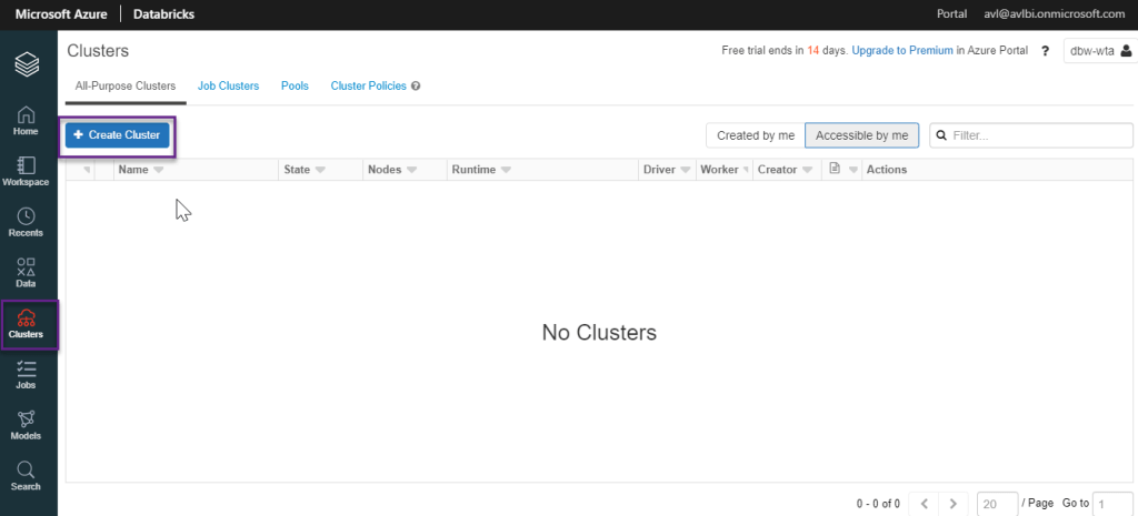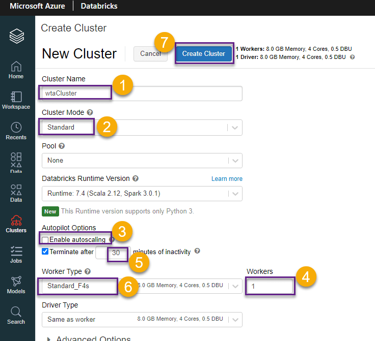 On the Databricks portal, click on Clusters in the vertical bar, and create a new Spark cluster by clicking + Create Cluster.