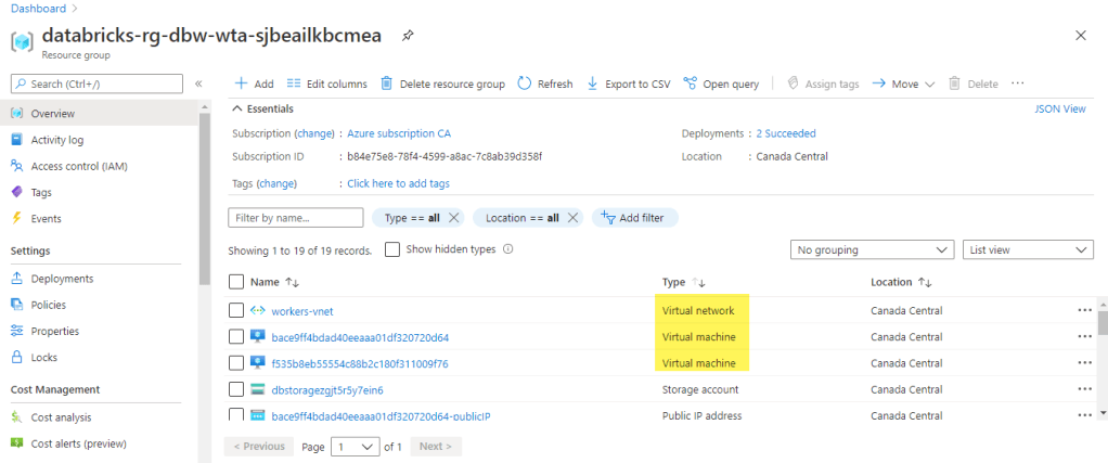 Just before we finish this post, head over to your dashboard on the Azure portal. Note that resources associated with the cluster (for example the two virtual machines for your two nodes) are deployed to a locked resource group databricks-rg-dbw-wta-………...