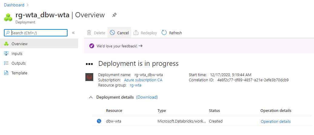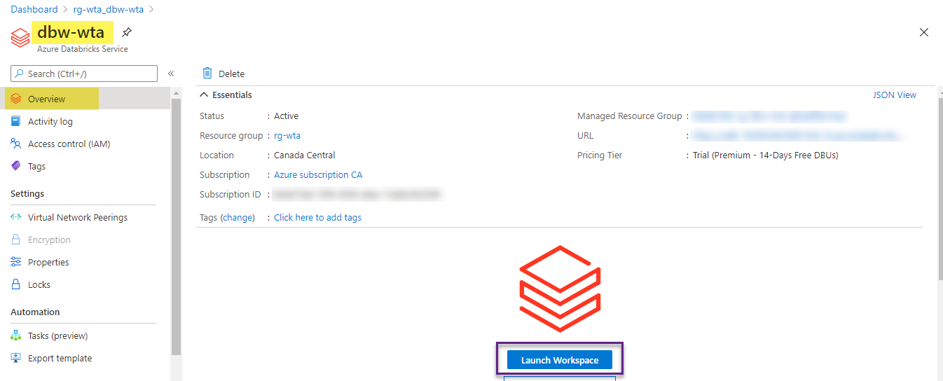 At this point you should be on the Overview page of your newly created dbw-wta databricks service.